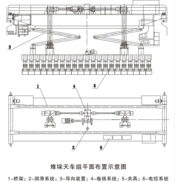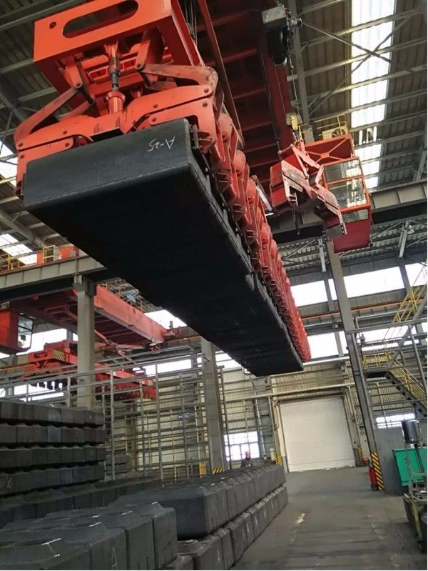 本產(chǎn)品通過自動夾鉗,每次可夾取21塊陽極碳塊,***高可堆成8層。橋架下面裝有工字鋼,工字鋼上裝有5t電動葫蘆,該葫蘆沿工字鋼運(yùn)行,可通過單塊自動碳塊夾鉗夾取碳塊,還可在車間吊運(yùn)零星雜物。運(yùn)行和起升全部采用變頻調(diào)速,全部操作均可在操縱室內(nèi)完成。采用機(jī)械重力式自動夾取代替氣動方式夾取碳塊,為制造廠和用戶大大節(jié)約了成本。